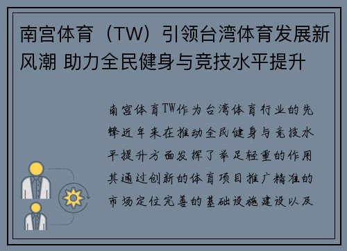 南宫体育(TW)引领台湾体育发展新风潮 助力全民健身与竞技水平提升