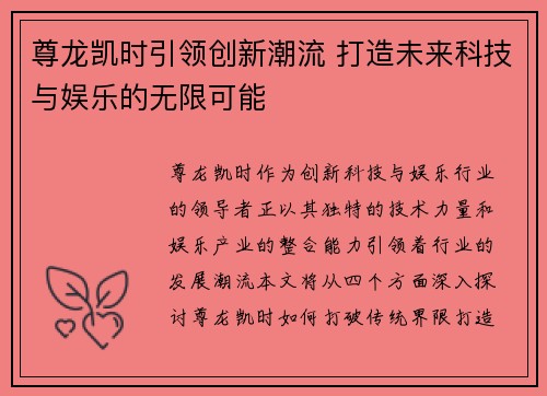 尊龙凯时作为创新科技与娱乐行业的领导者,正以其独特的技术力量和娱乐产业的整合能力,引领着行业的发展潮流。本文将从四个方面深入探讨尊龙凯时如何打破传统界限,打造未来科技与娱乐的无限可能。首先,我们将分析尊龙凯时在技术创新上的突破,如何推动整个行业的进步;其次,探讨其在娱乐内容创作上的引领作用,如何通过融合科技与艺术,创造全新的体验;第三,着眼于尊龙凯时在用户互动和体验优化上的努力,如何通过精确的数据分析和智能系统提升用户满意度;最后,分析尊龙凯时的未来发展战略,如何借助前沿技术进一步推动科技与娱乐的融合,为全球用户提供更丰富多彩的服务。整篇文章将以这些关键点为基础,展现尊龙凯时如何塑造未来娱乐与科技的无限可能。